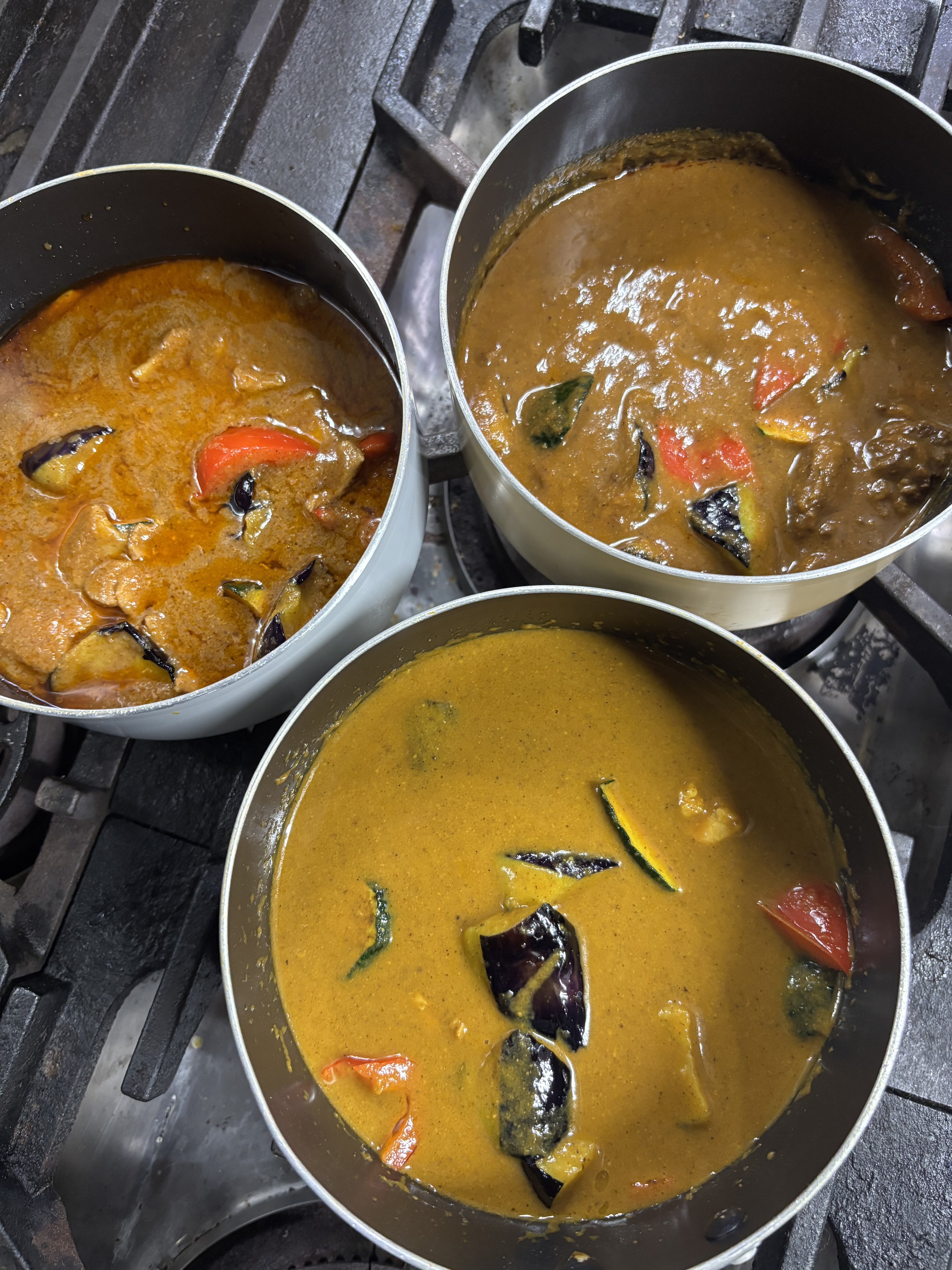じっくり煮込んで作った鶏ガラ野菜ベースを使用したご家庭でおなじみの欧風カレーです。チキン(ココナッツ風味をきかせています)、ビーフ(赤ワインで煮込んだ肩ロースを使っています)、ポーク(薄切りのバラ肉を大量のショウガとニンニクで煮込みました)の3種類からお選びください。ライスとは別にソースポットでお出ししますので、数人で各種をシェアして楽しむ事も出来ます。無料のお飲み物(お冷、麦茶など)は付いております。